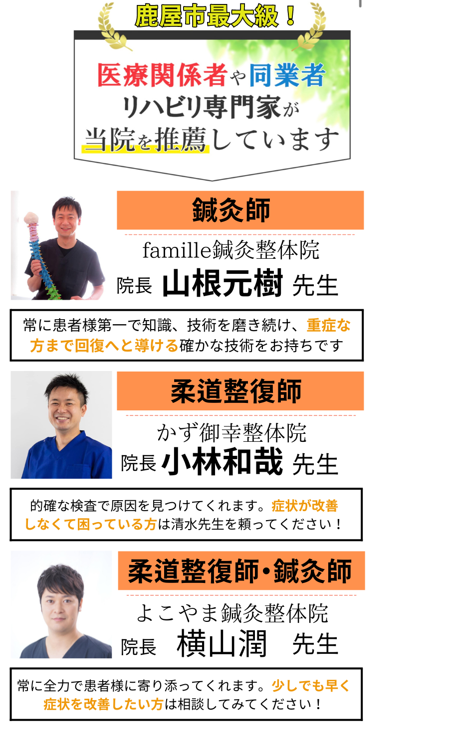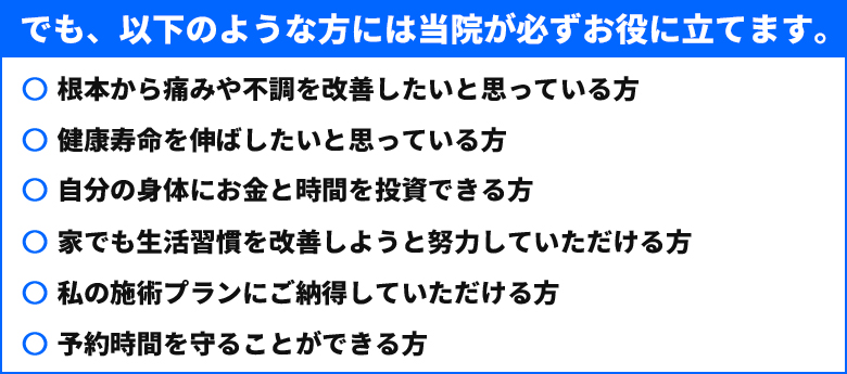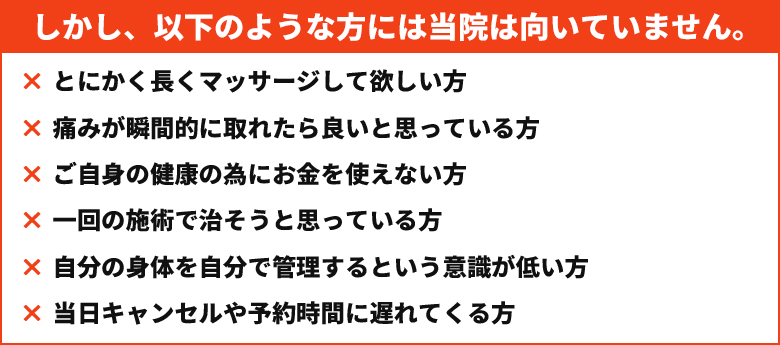 また、当院周辺にも多くの整体院や接骨院があり、その中でどこが自分の状態にあったところなのかを見極めるのは難しいことだと思います。