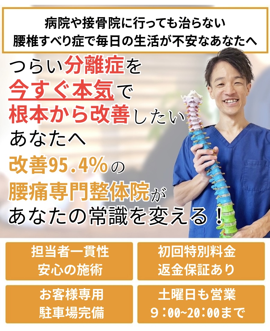 腰痛専門すまいむ整体院なら腰椎分離症によって日々つらい思いをしているあなたのお悩みを解決することができます。