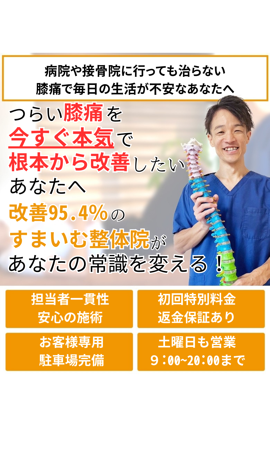 腰痛専門すまいむ整体院なら膝の痛みによって日々つらい思いをしているあなたのお悩みを解決することができます。
